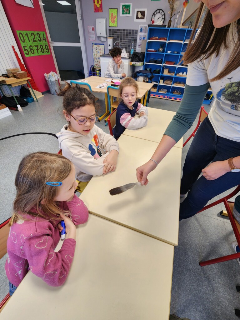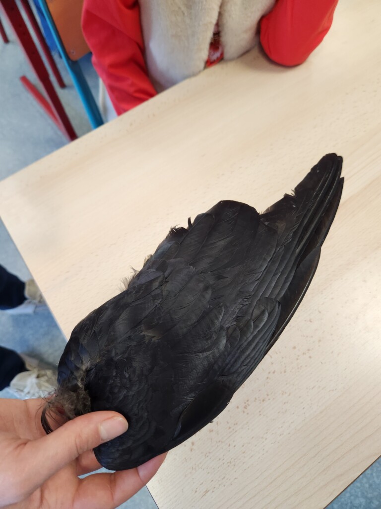 Nous avons ensuite observé une plume et une aile. L’étanchéité du plumage nous a vraiment surpris. En effet, la plume possède un rachis (tige) et des vexils (de longs poils). D’autres poils très fins, non visibles à l’œil nu, s’entrecroisent et rendent imperméable la plume. Ce dispositif protège l’oiseau du vent, de la pluie et du froid.
