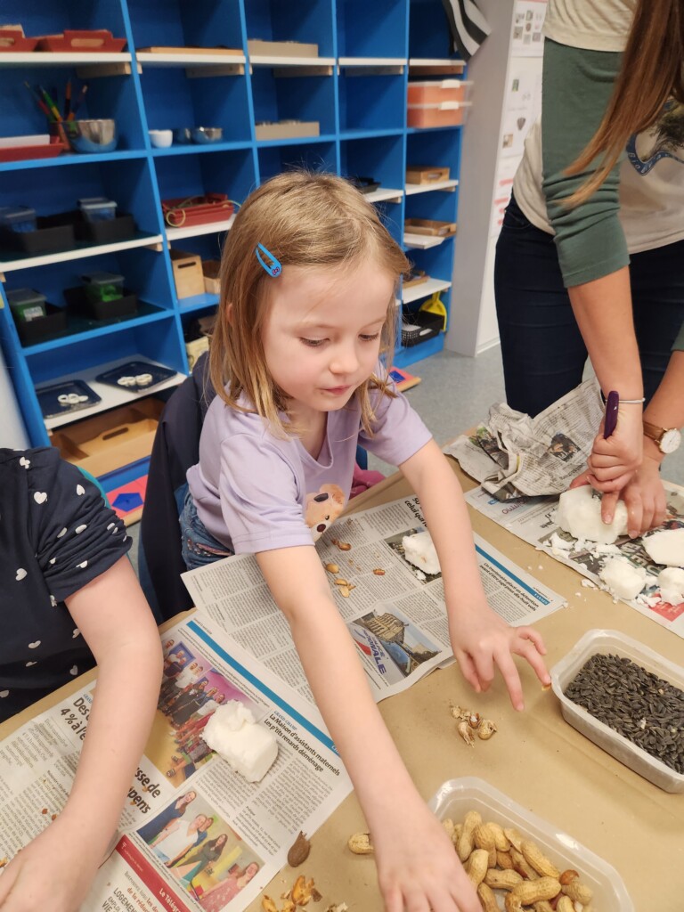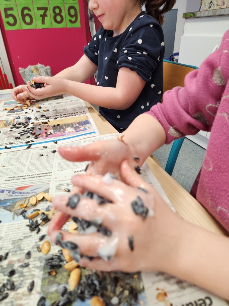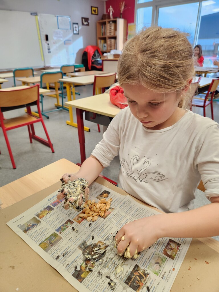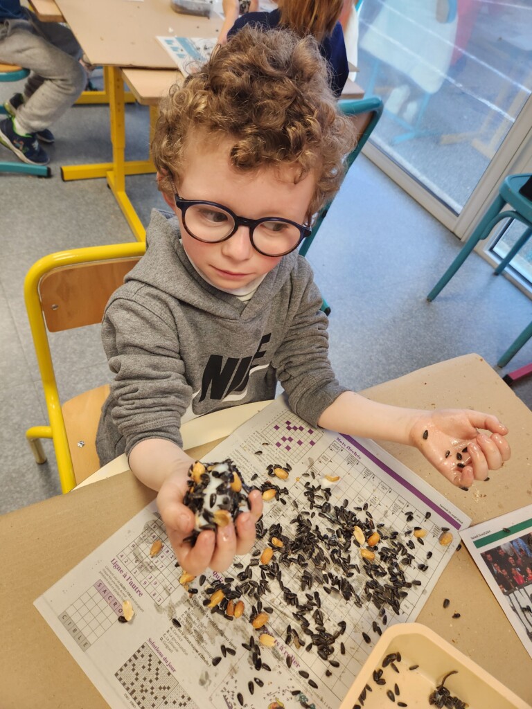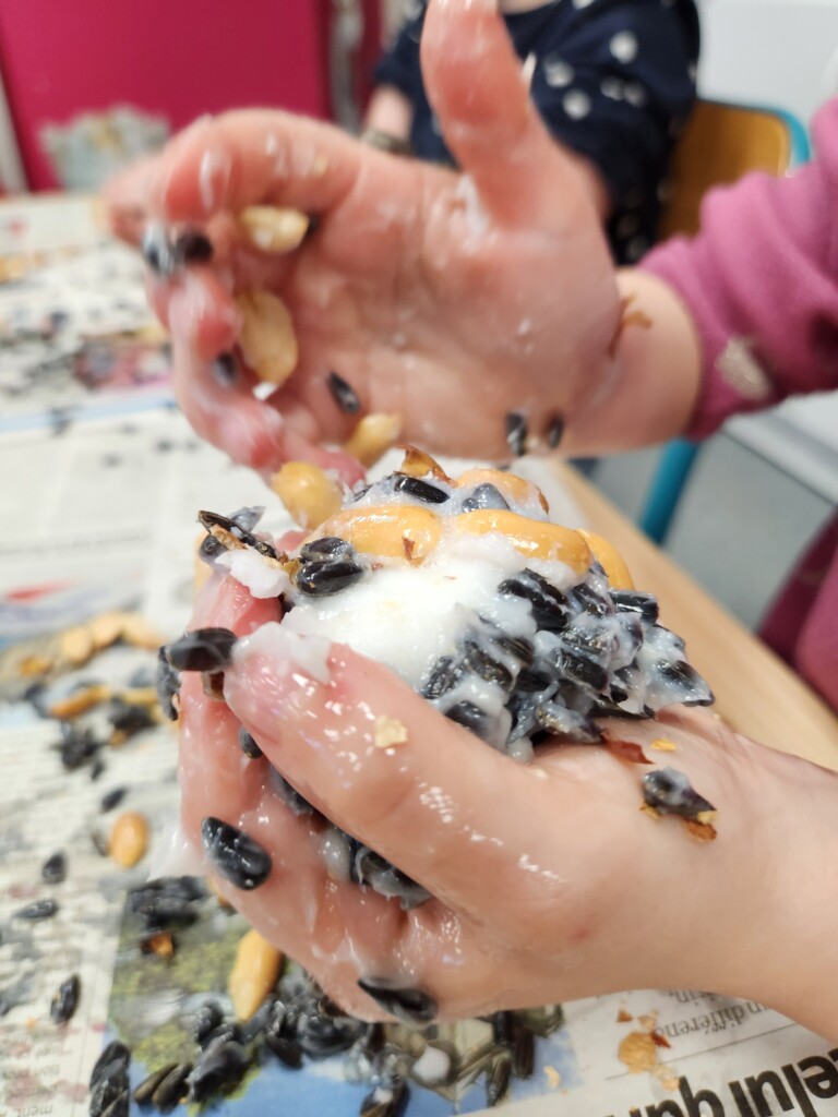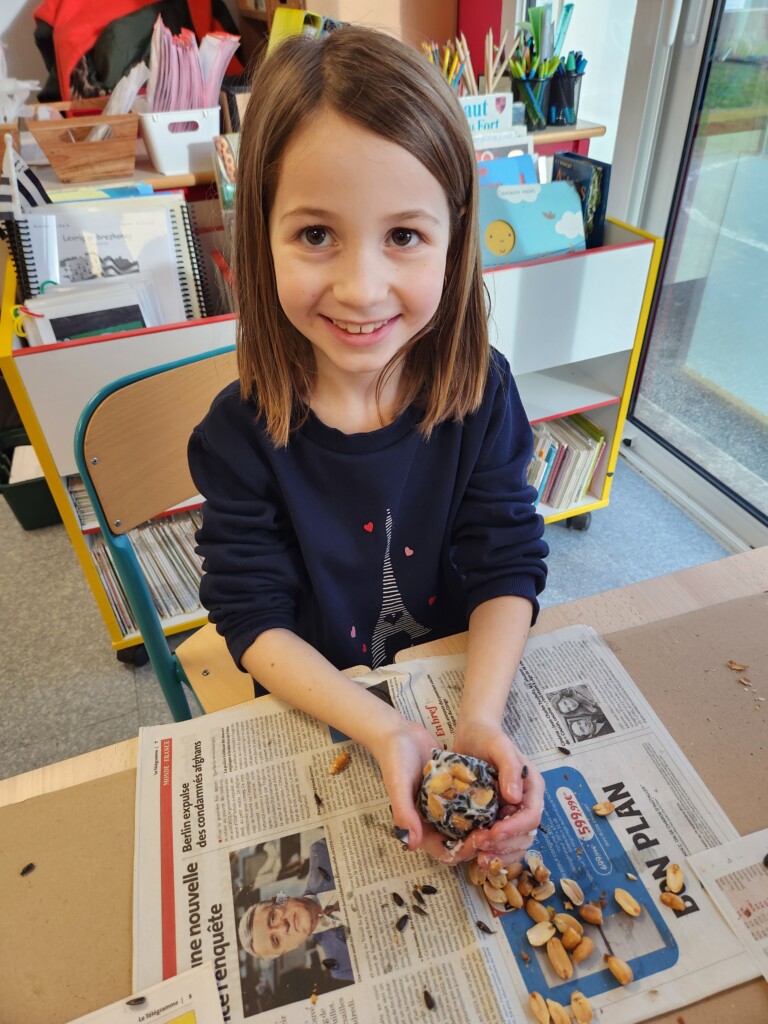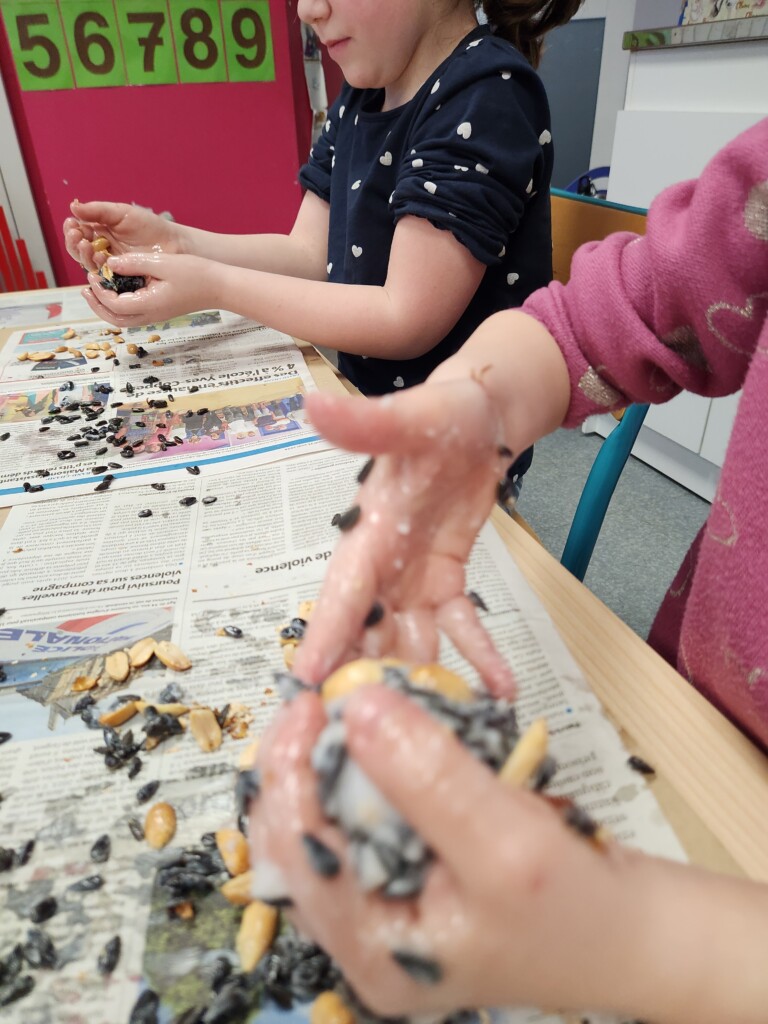 Nous avons enfin appris certains noms d’oiseaux et fabriqué des boules de graisses qui nourriront les oiseaux le reste de l’hiver à l’école ou dans nos jardins.
