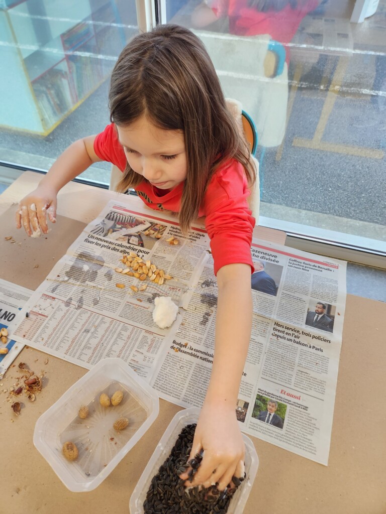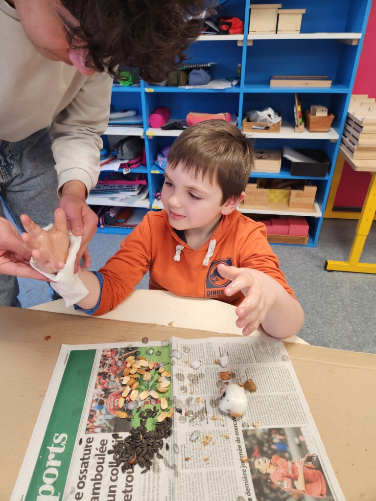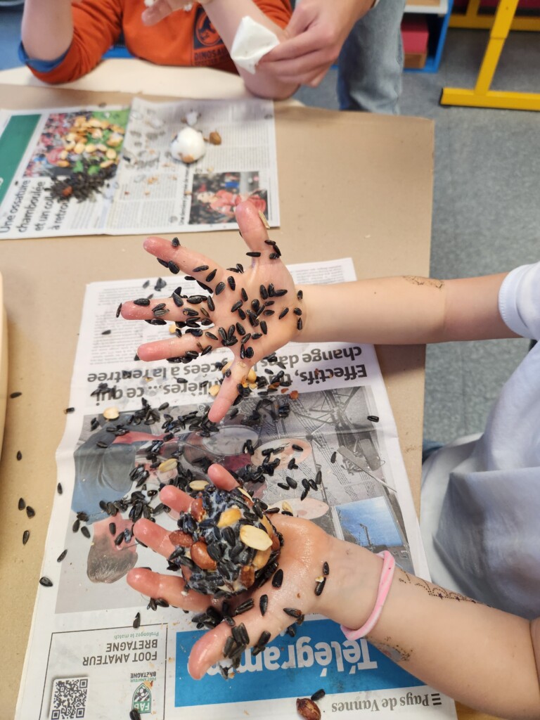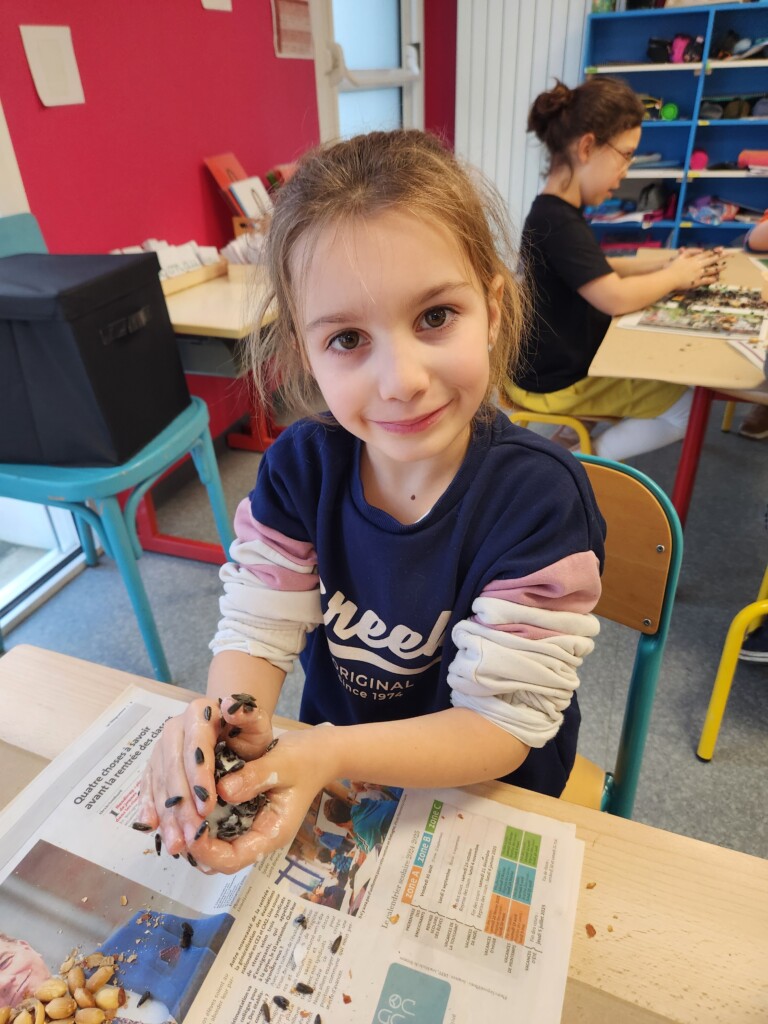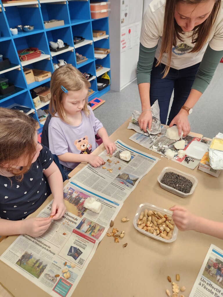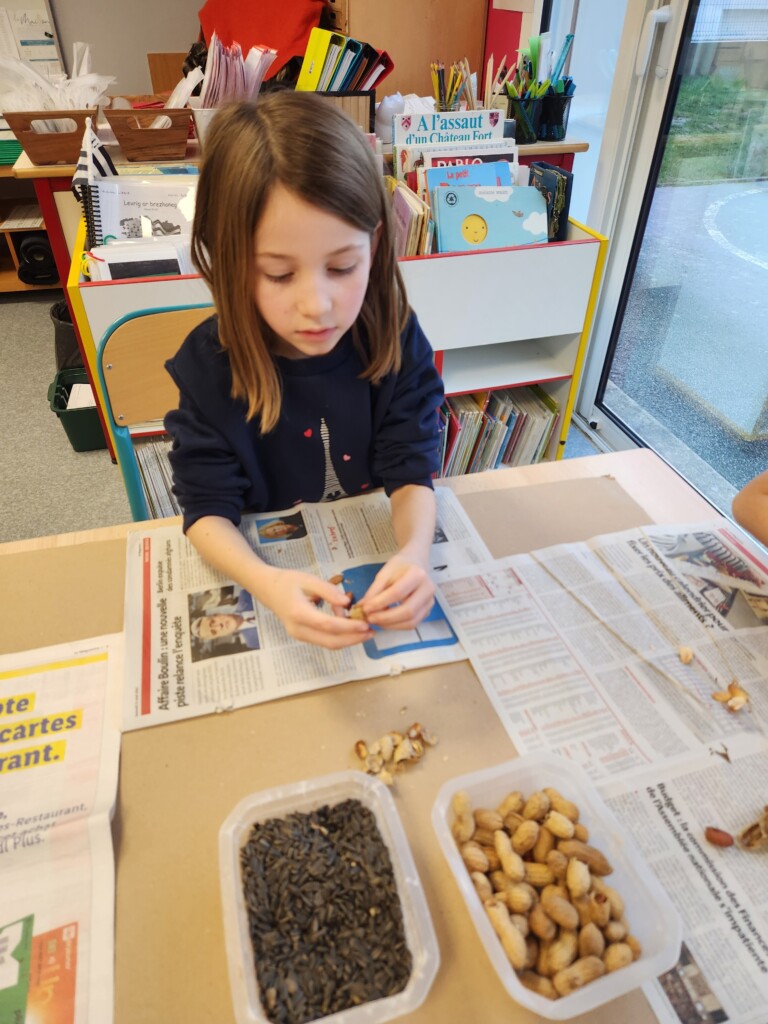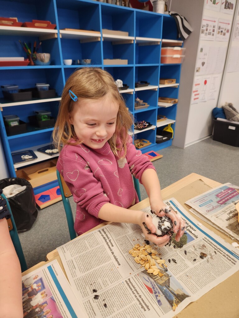Nous avons enfin appris certains noms d’oiseaux et fabriqué des boules de graisses qui nourriront les oiseaux le reste de l’hiver à l’école ou dans nos jardins.