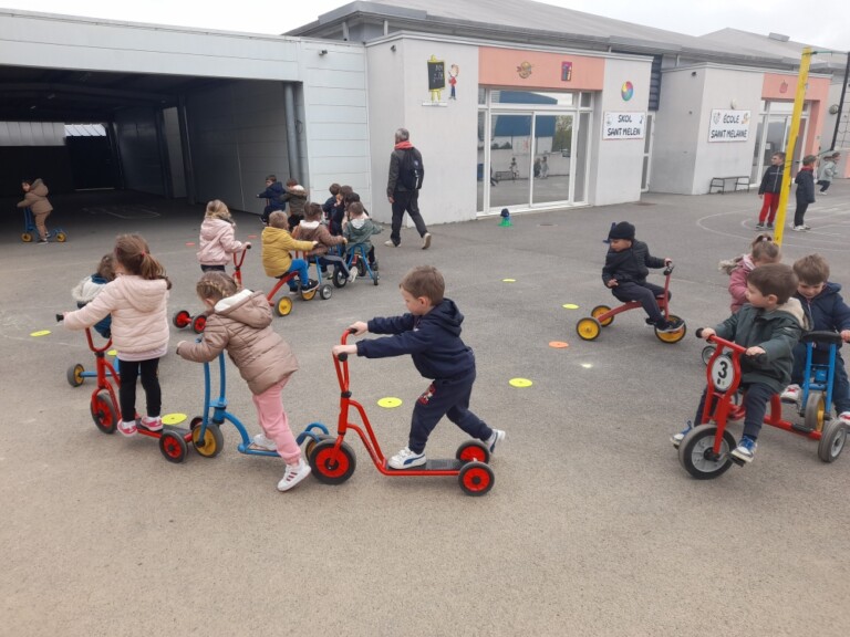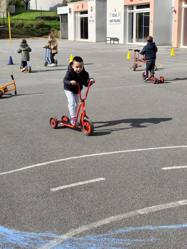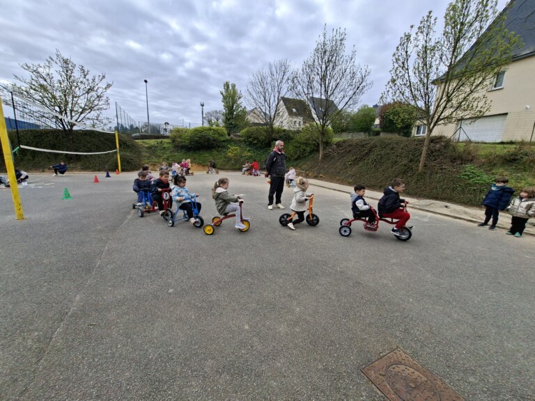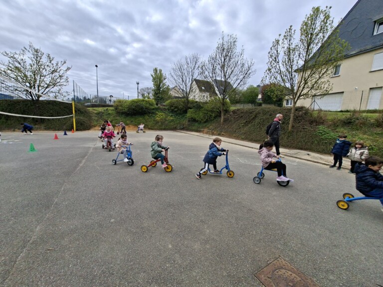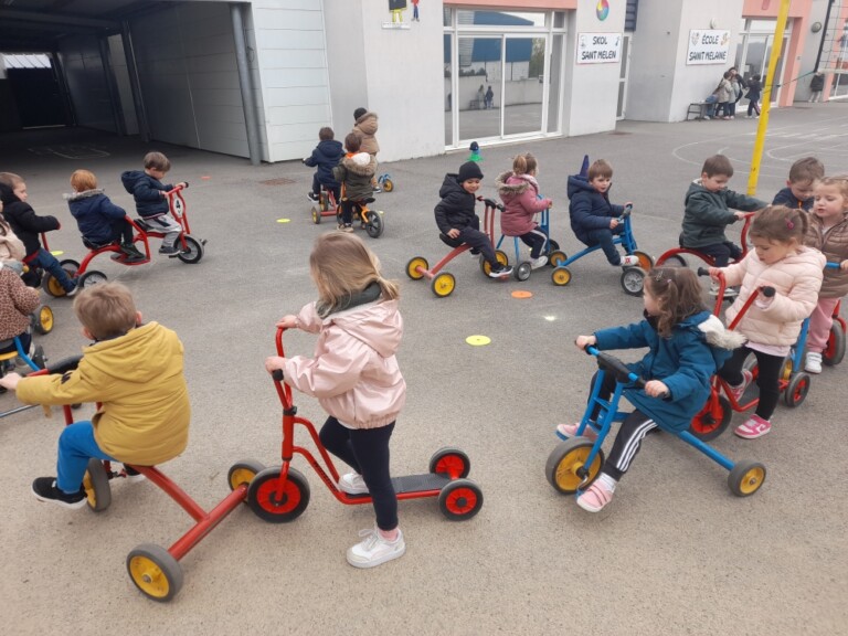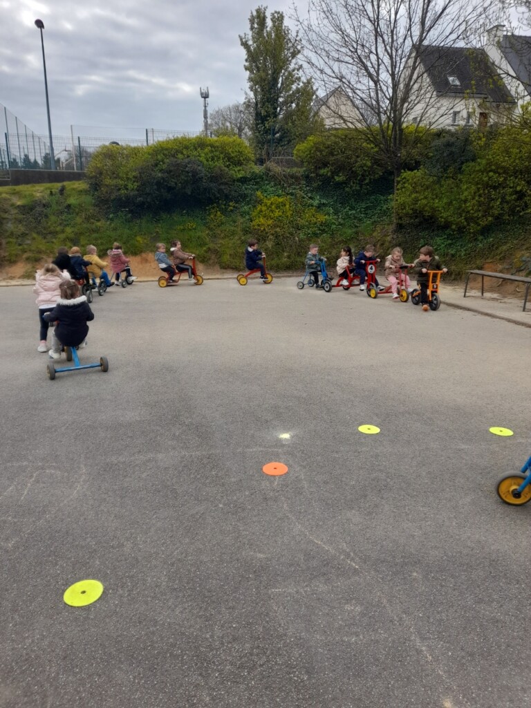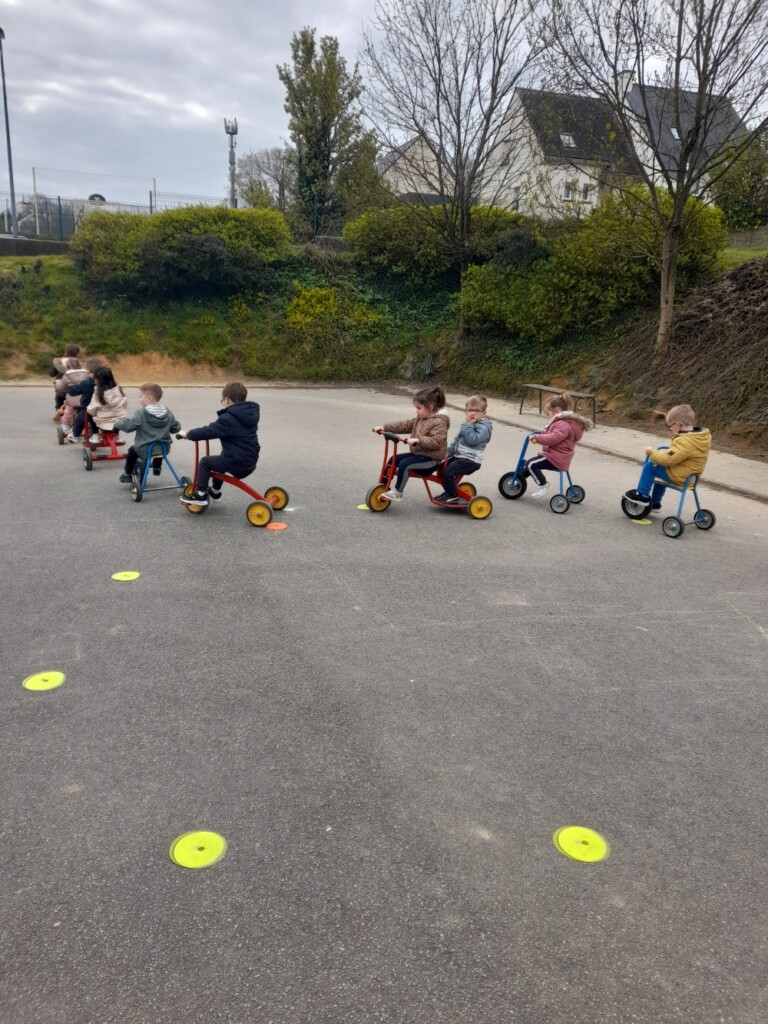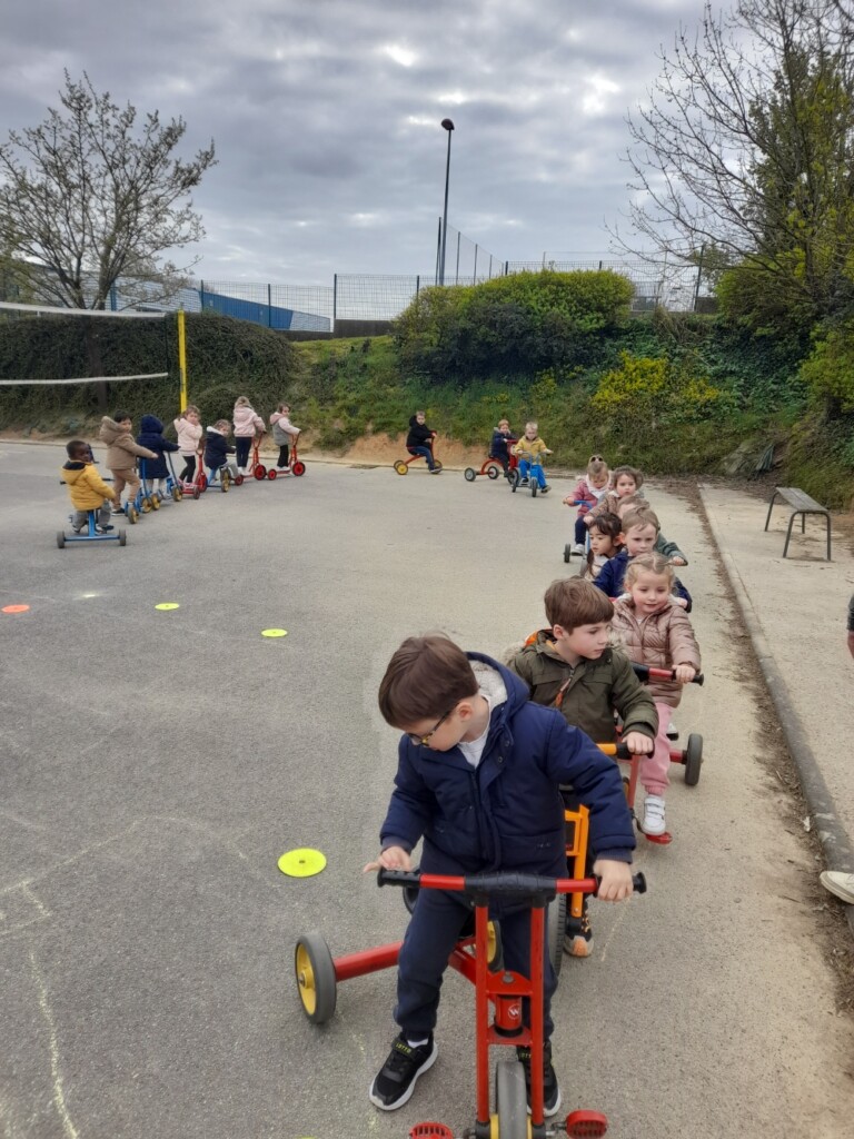 En cette quatrième période, Julien a proposé aux enfants des ateliers avec les engins roulants : vélos, trottinettes Conduire le vélo, la trottinette à 2, suivre un parcours, avancer, reculer, faire des relais, faire une chenille, le jeu de l’horloge, etc..