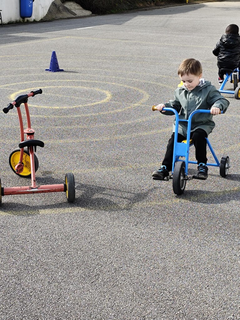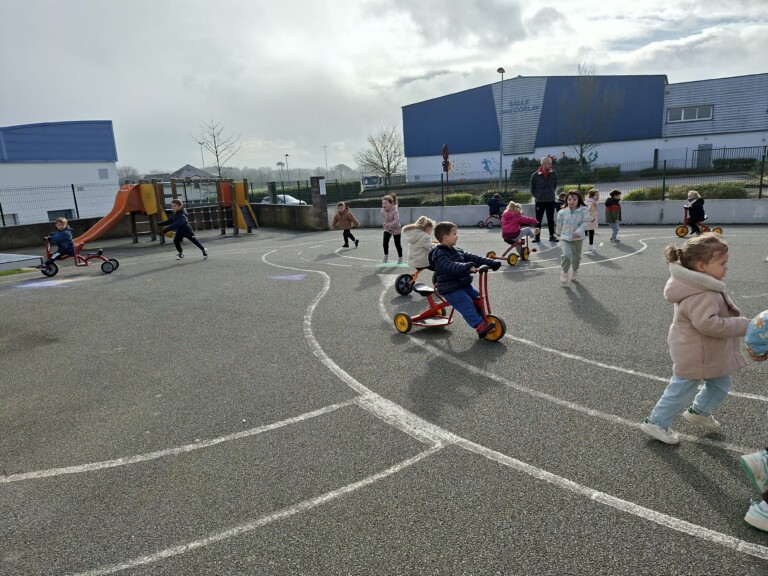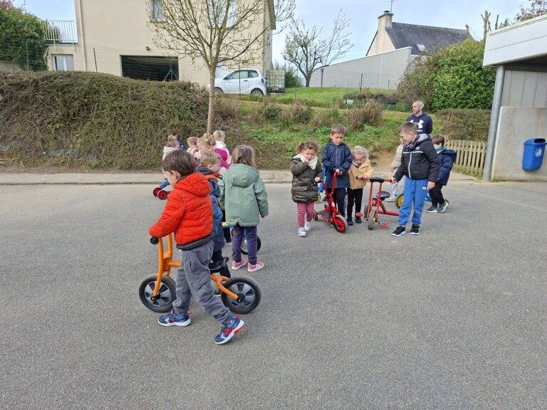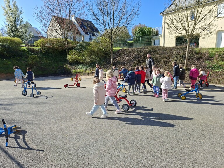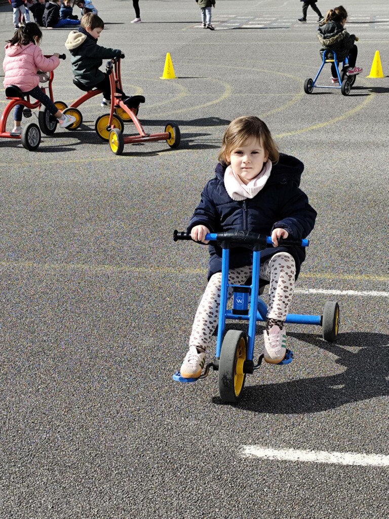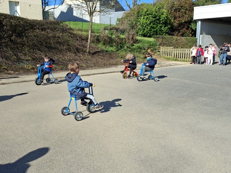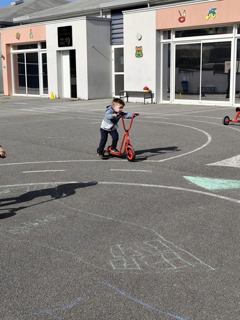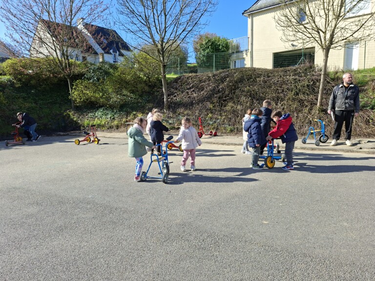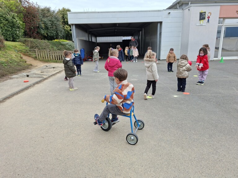 En cette quatrième période, Julien a proposé aux enfants des ateliers avec les engins roulants : vélos, trottinettes Conduire le vélo, la trottinette à 2, suivre un parcours, avancer, reculer, faire des relais, faire une chenille, le jeu de l’horloge, etc..