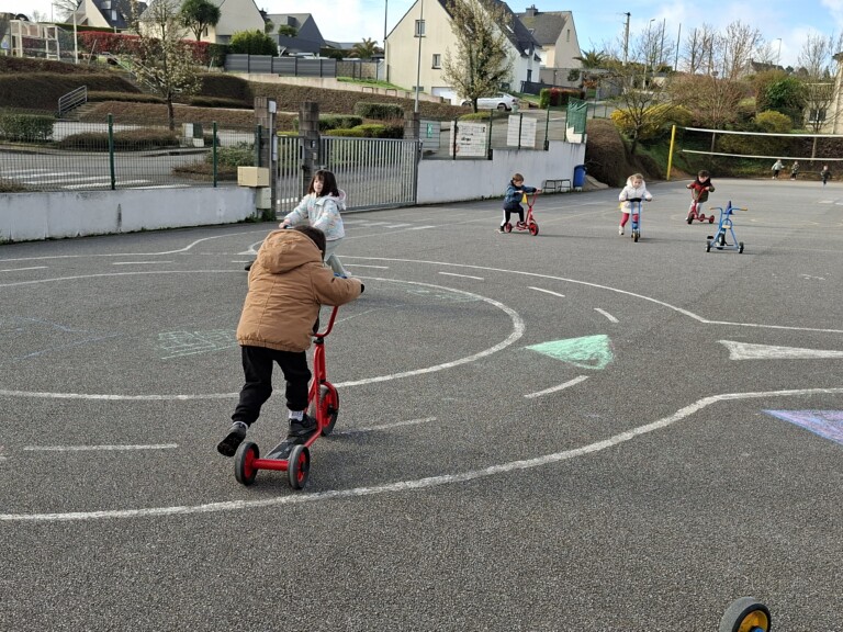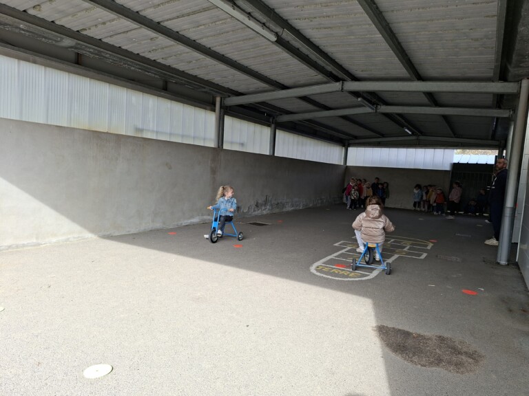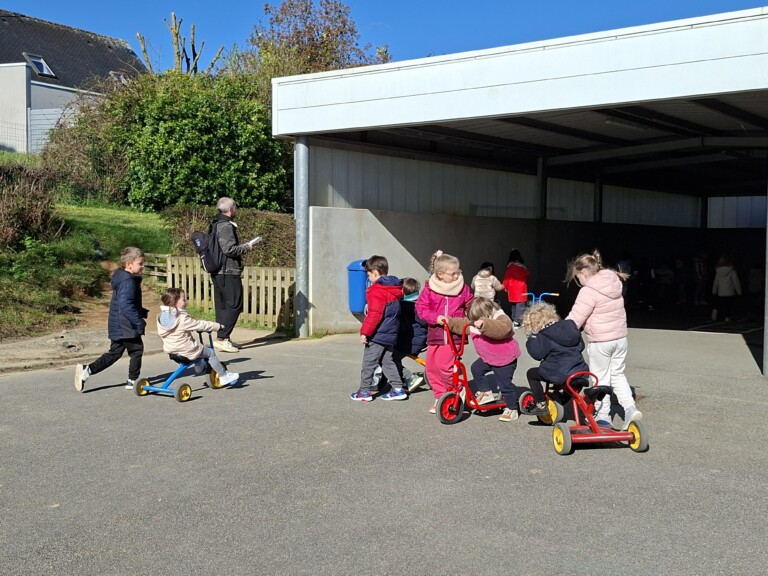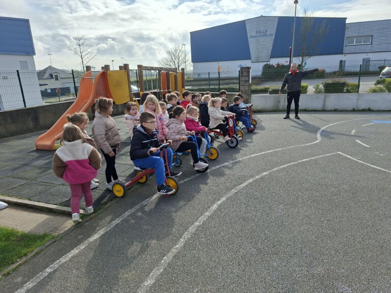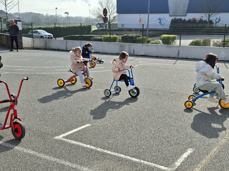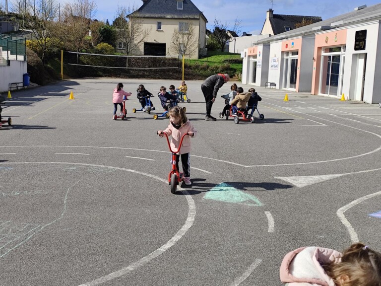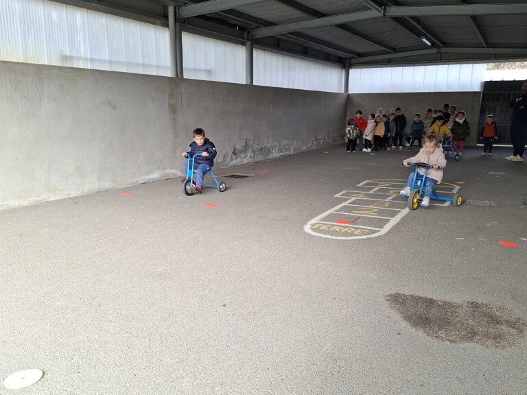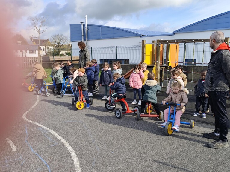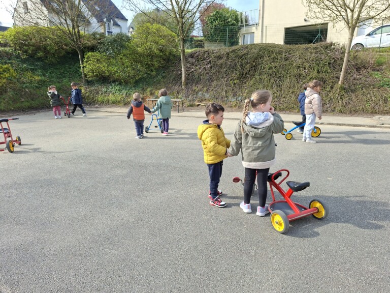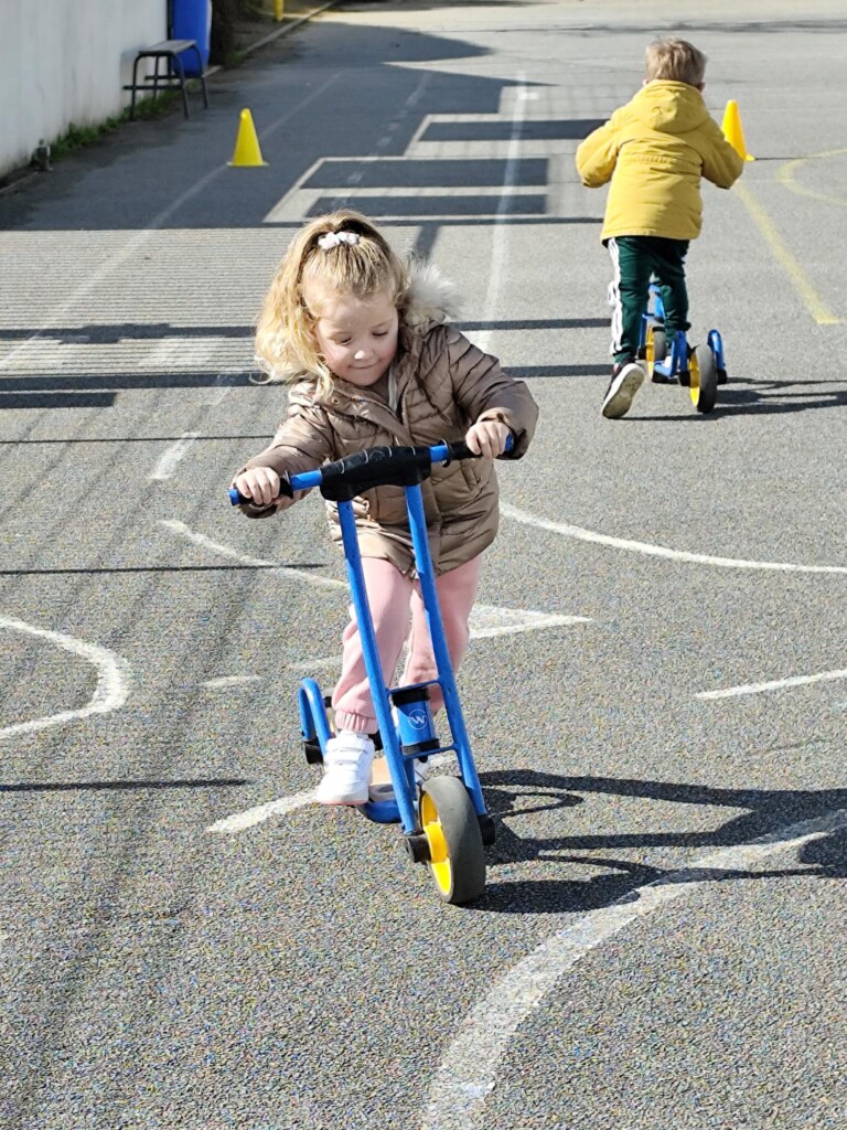 En cette quatrième période, Julien a proposé aux enfants des ateliers avec les engins roulants : vélos, trottinettes Conduire le vélo, la trottinette à 2, suivre un parcours, avancer, reculer, faire des relais, faire une chenille, le jeu de l’horloge, etc..