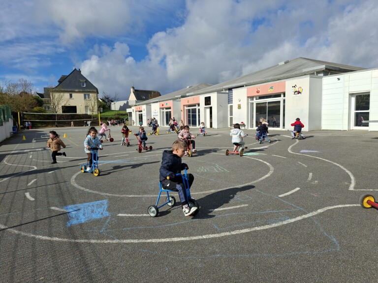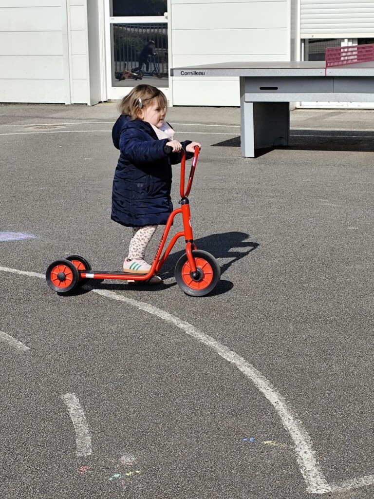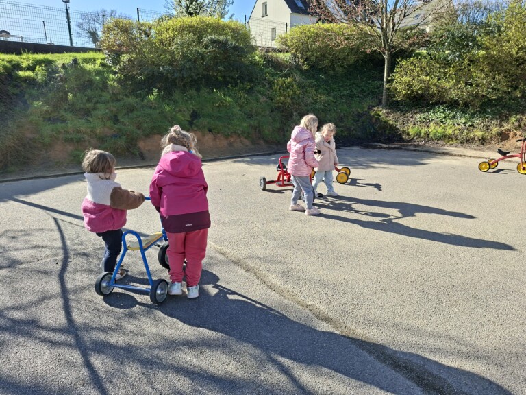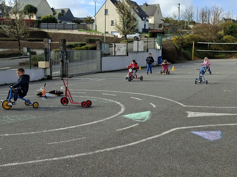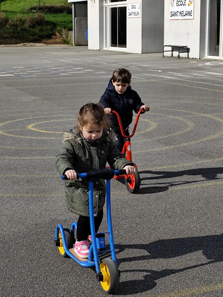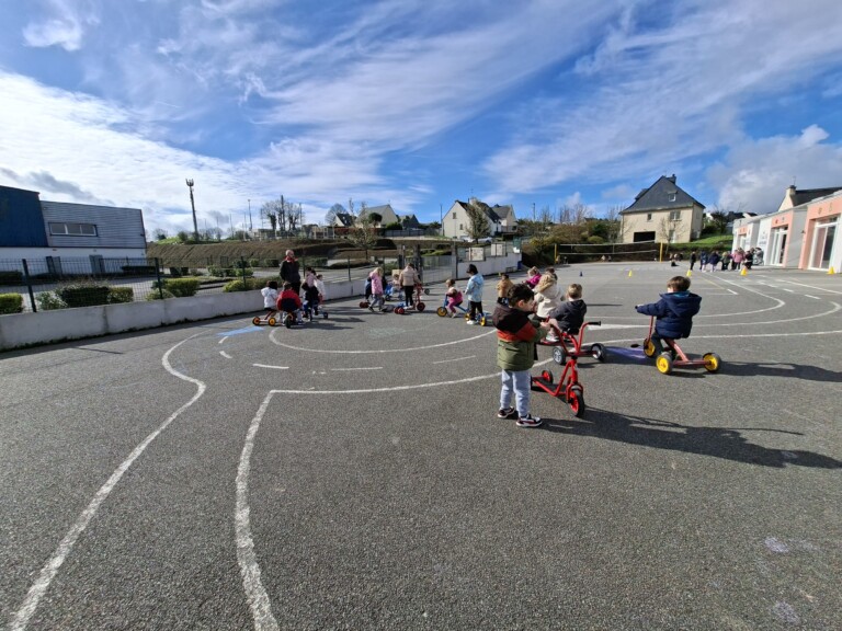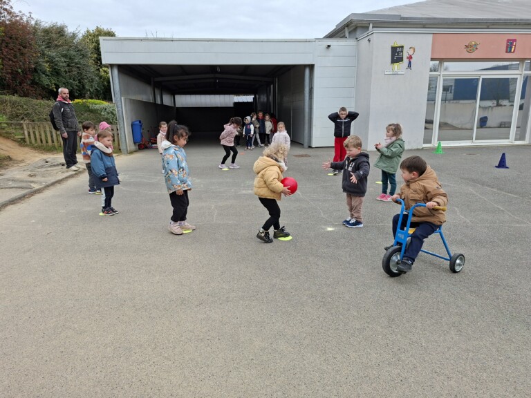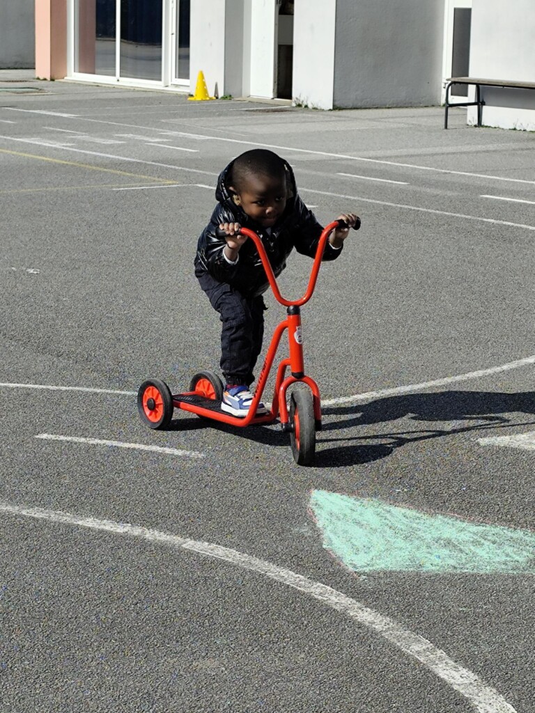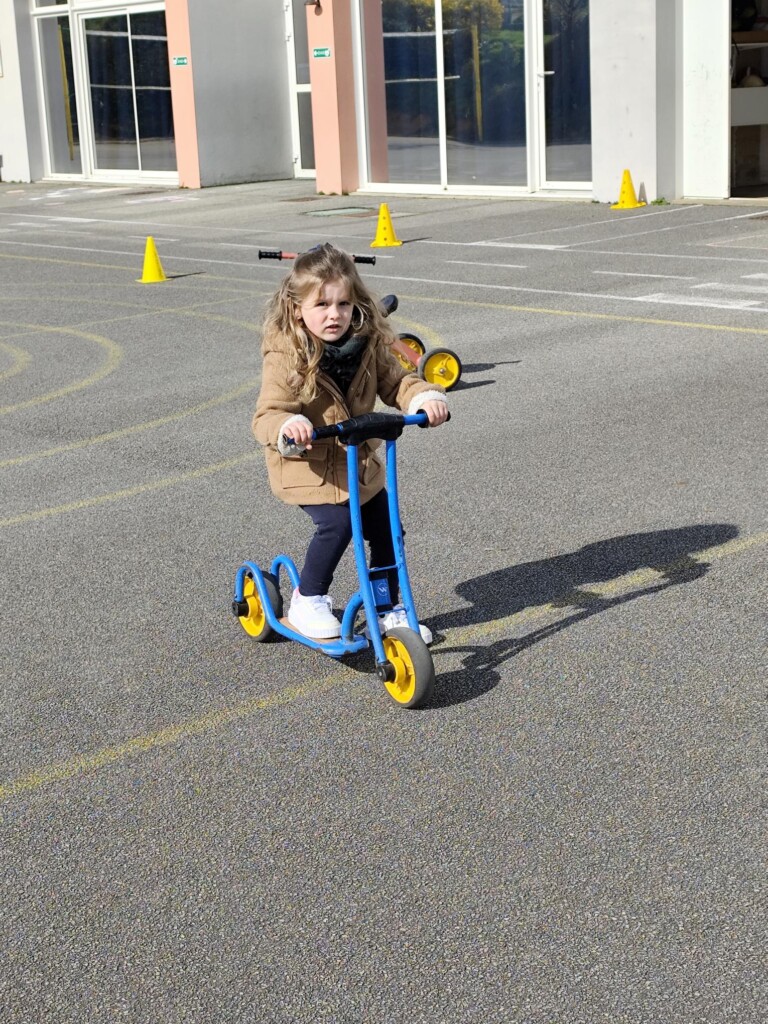 En cette quatrième période, Julien a proposé aux enfants des ateliers avec les engins roulants : vélos, trottinettes Conduire le vélo, la trottinette à 2, suivre un parcours, avancer, reculer, faire des relais, faire une chenille, le jeu de l’horloge, etc..