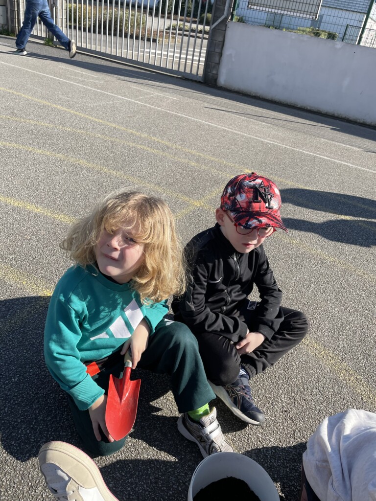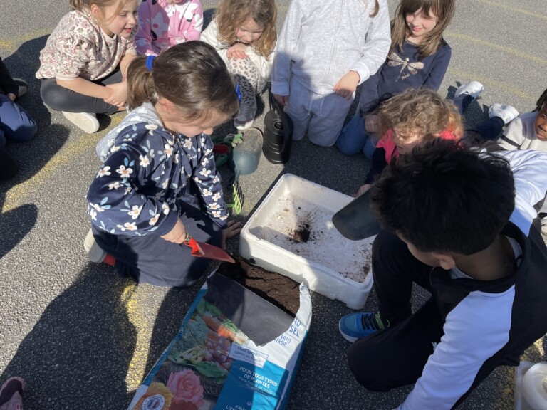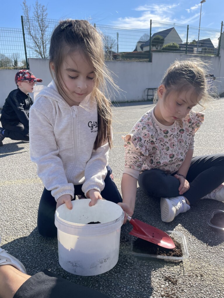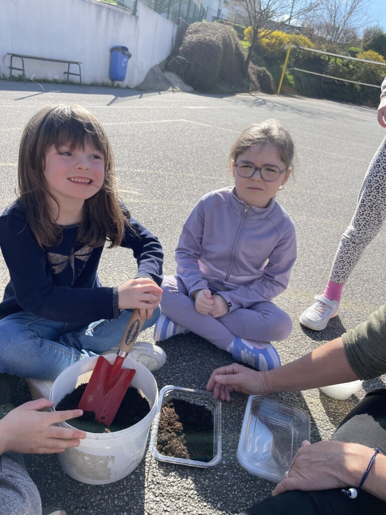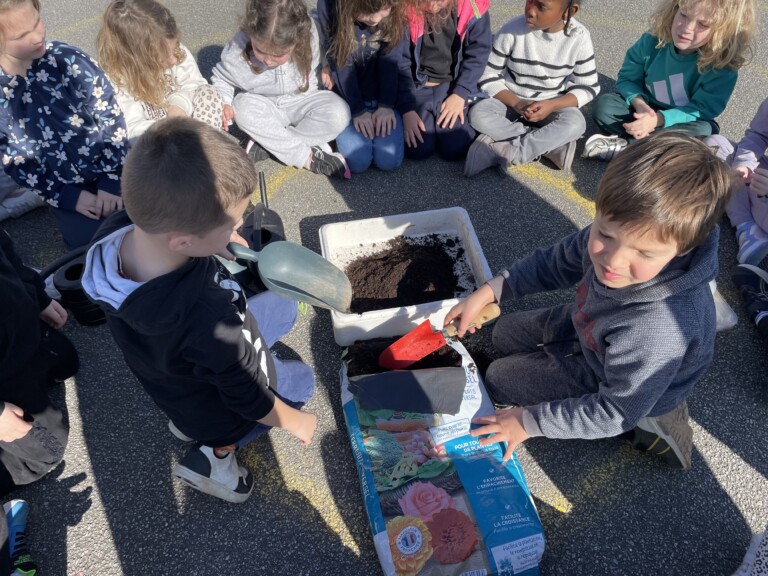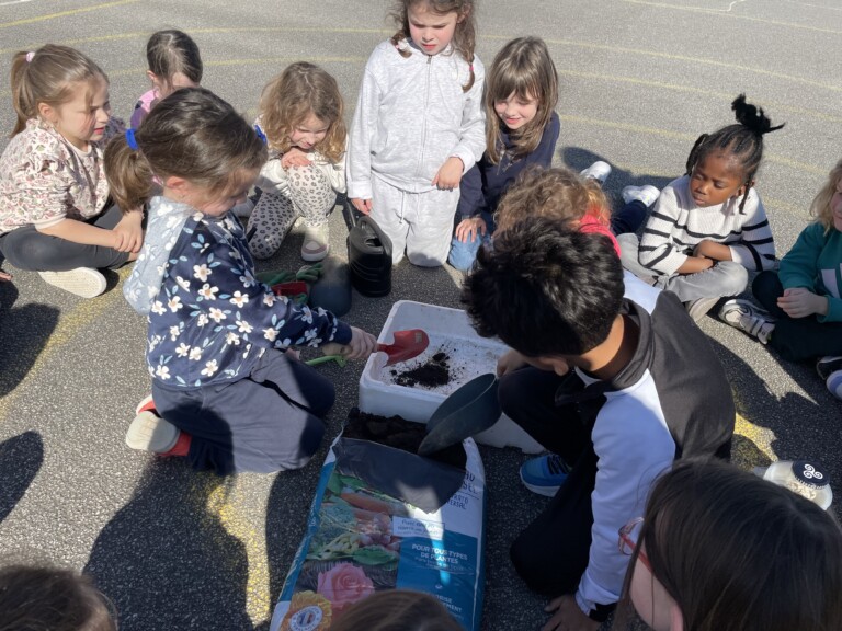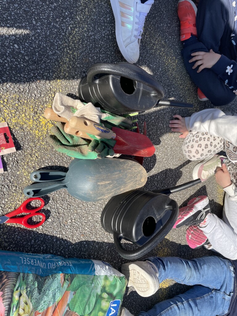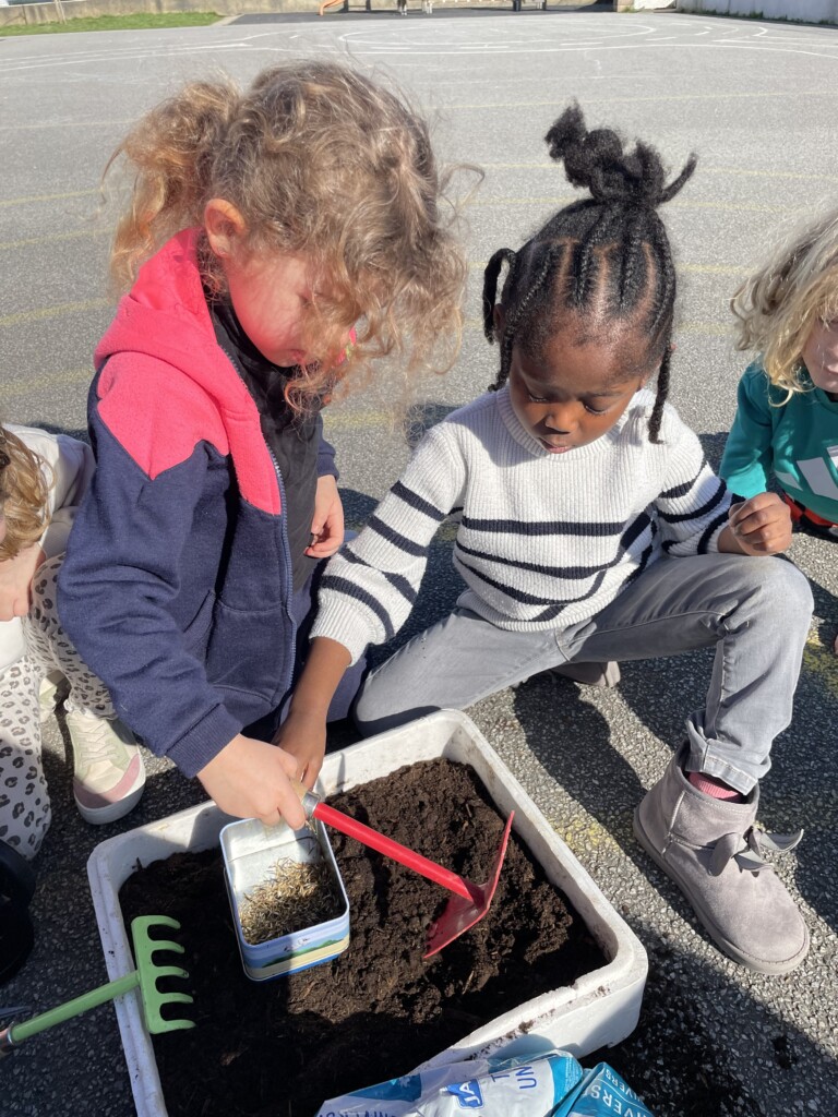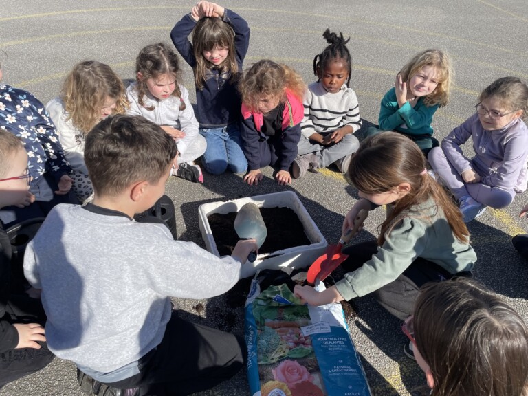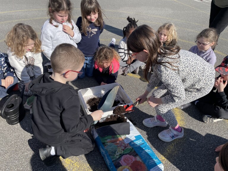 Durant la période 4, les élèves de GS-CP ont travaillé autour du thème du printemps et du jardinage. Ils ont réalisé des semis et des plantations en classe (cosmos, radis, tournesols, œillets d’Inde), qu’ils ont ensuite installés dans le jardin pédagogique et dans le patio. Les enfants peuvent ainsi observer la croissance des végétaux au fil du temps et comparer les cultures réalisées à l’intérieur et à l’extérieur. Ces activités leur permettent de découvrir les besoins des plantes tout en développant leur sens de l’observation.
