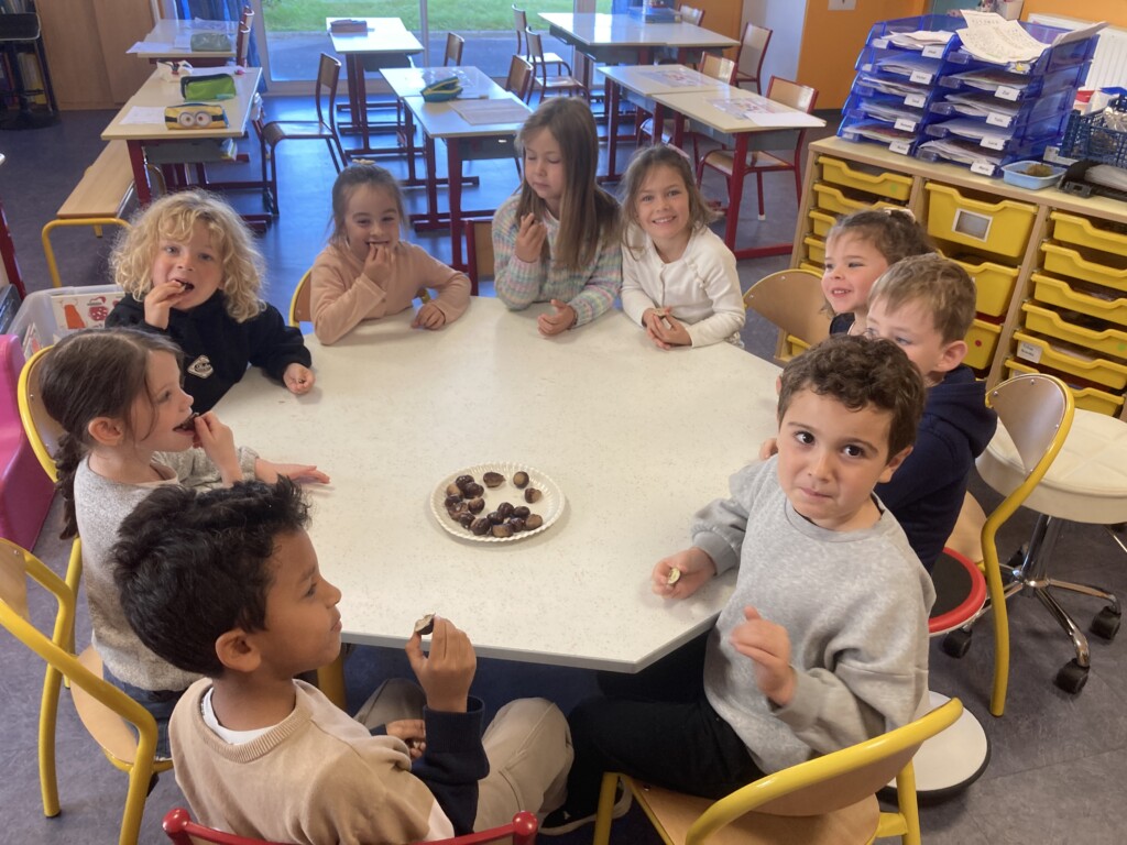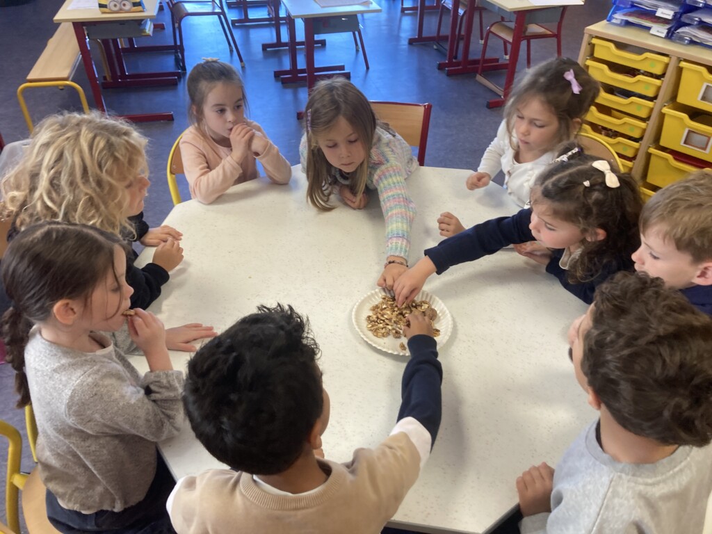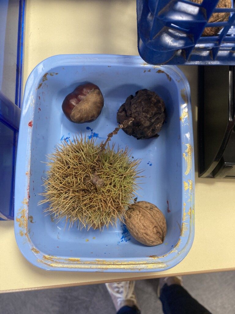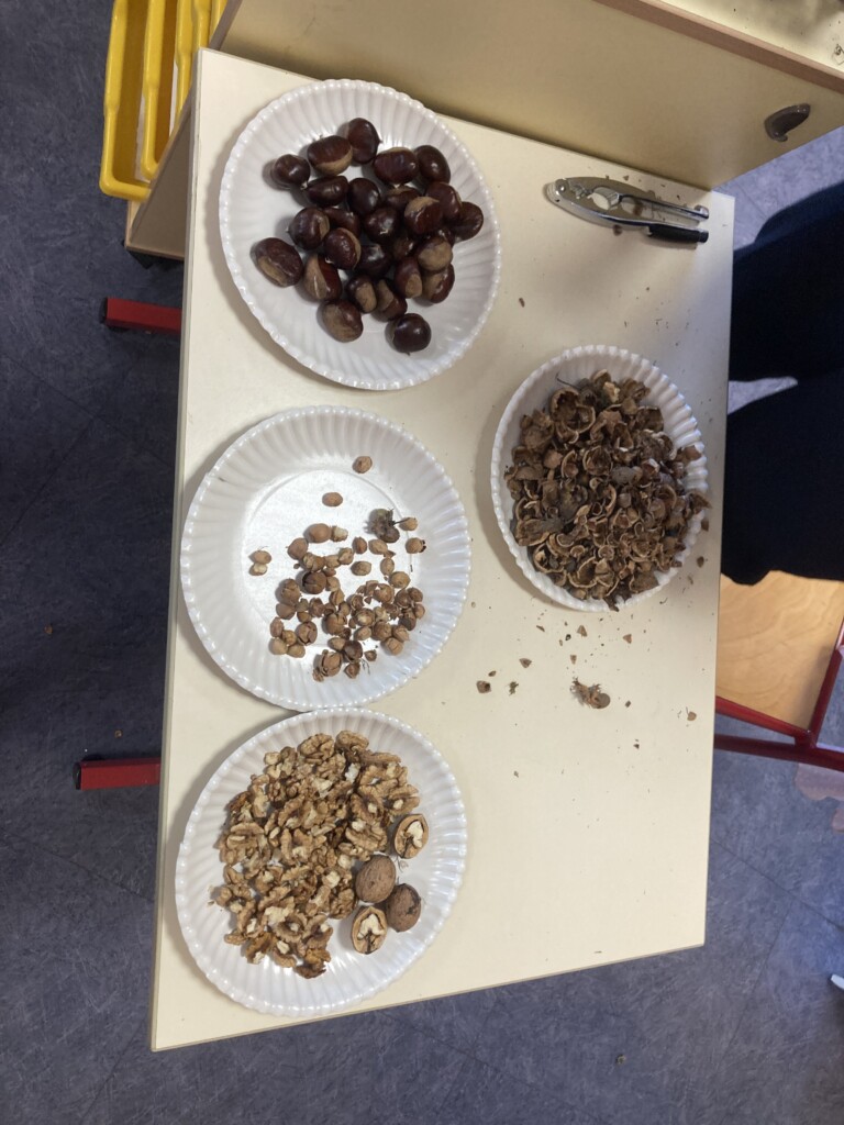 Tout au long du mois, nous avons exploré le thème de l’automne à travers des activités artistiques et sensorielles : les enfants ont réalisé de jolies créations aux couleurs de la saison et ont pu déguster différents fruits d’automne (noix, noisettes, châtaignes).
