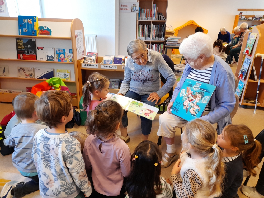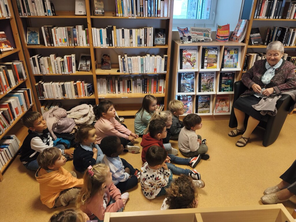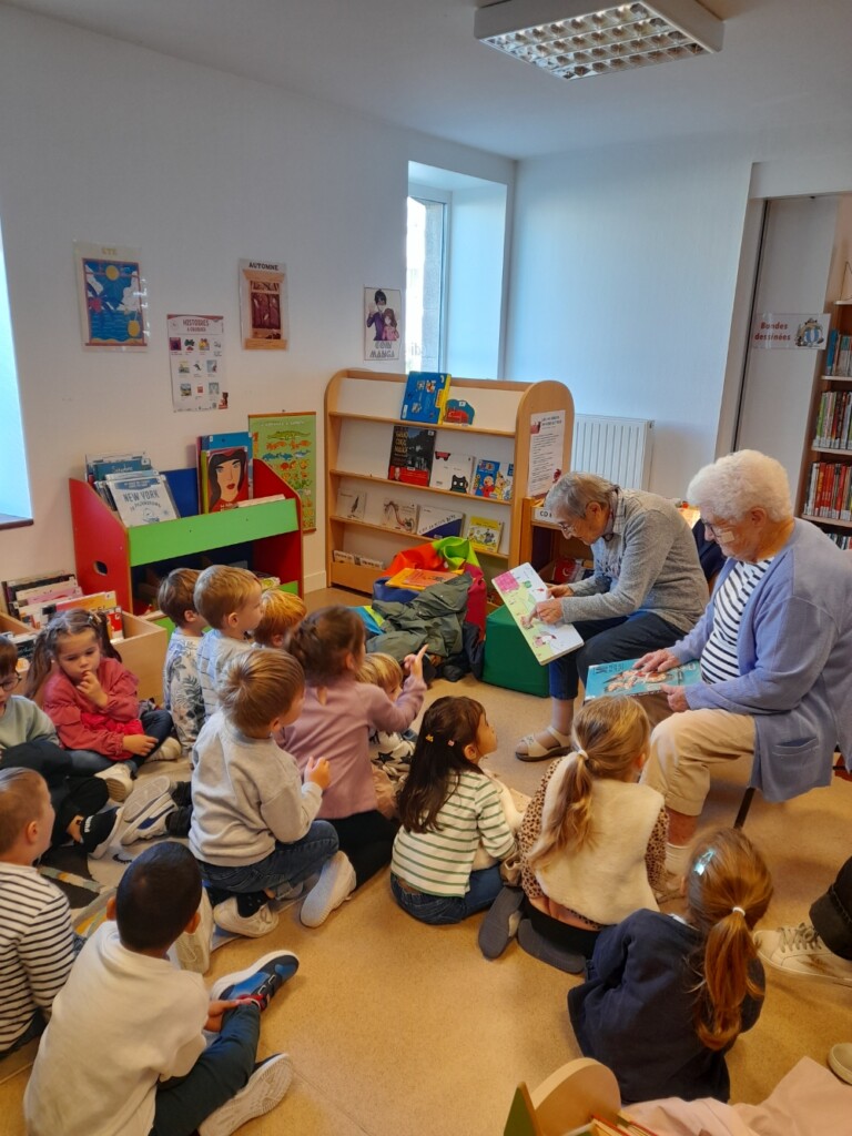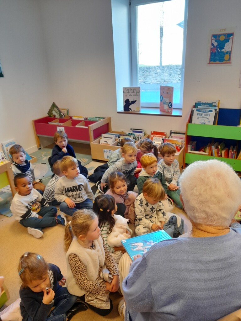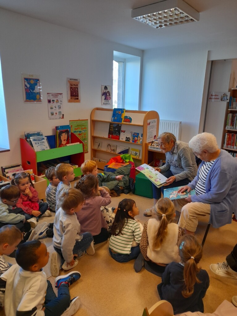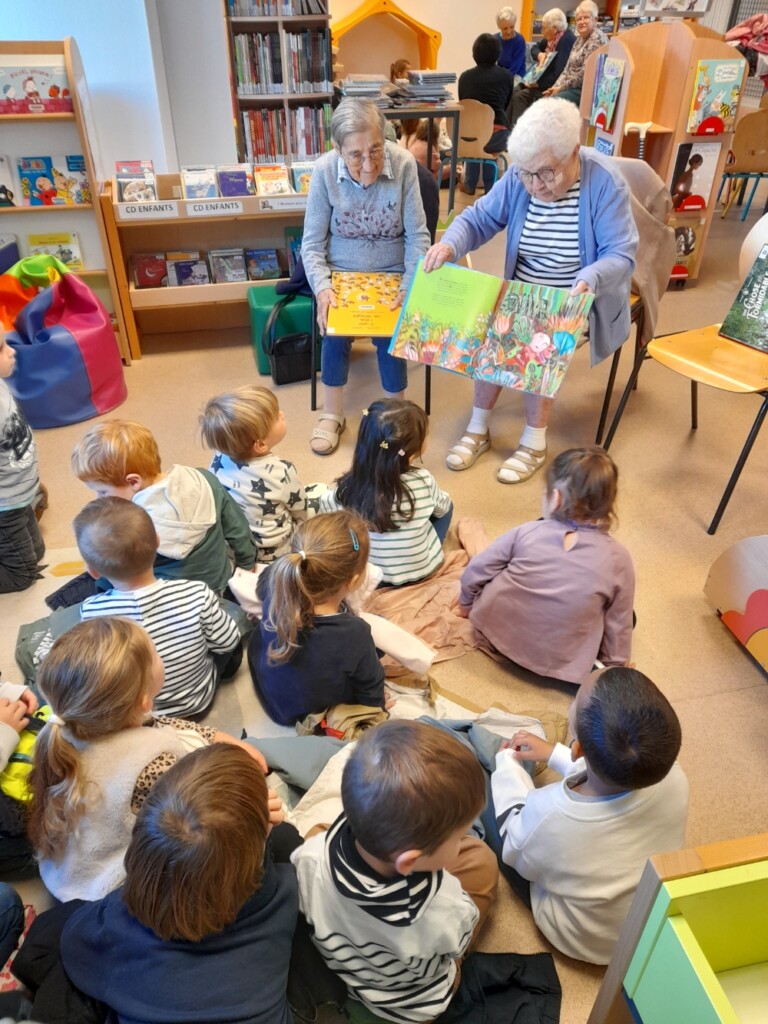 Dans le cadre de la Semaine Bleue, les élèves de maternelles bilingue et monolingue se sont rendus à la médiathèque, à la rencontre des soeurs de Kermaria. Elles ont lu des histoires et ont pu discuter et même chanter avec les enfants. Nous avons tous passé un bon moment !