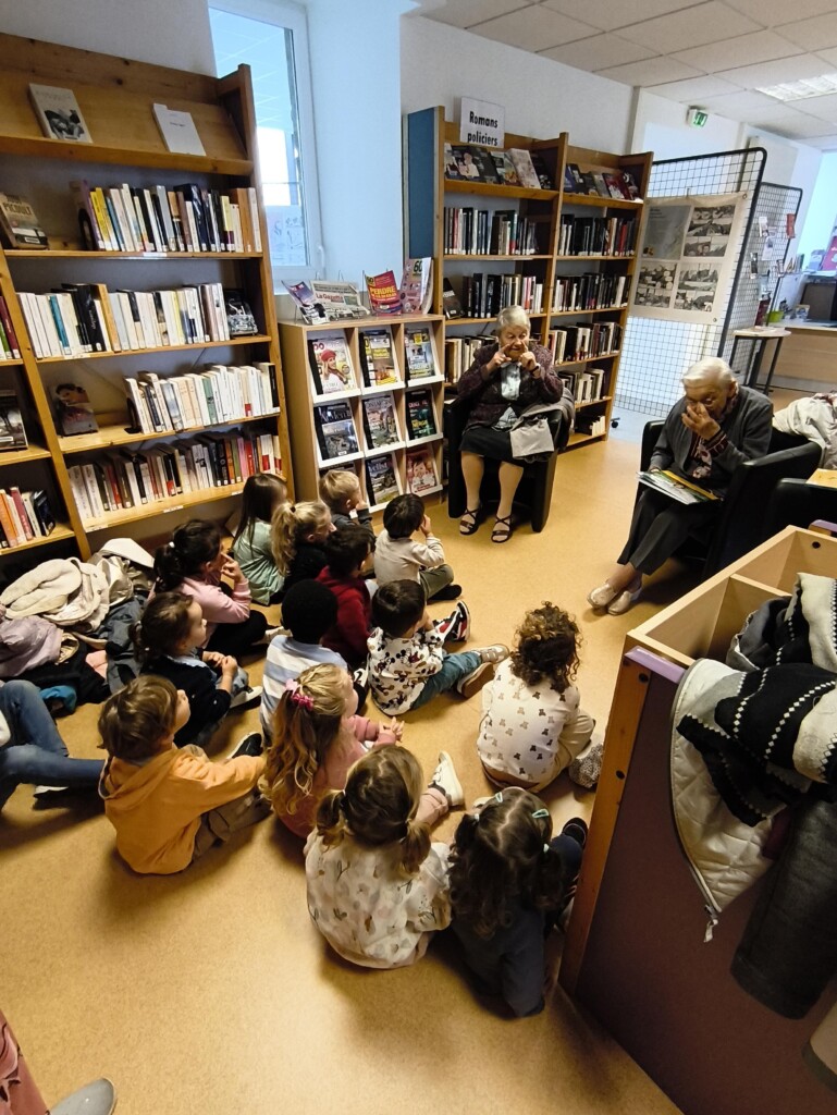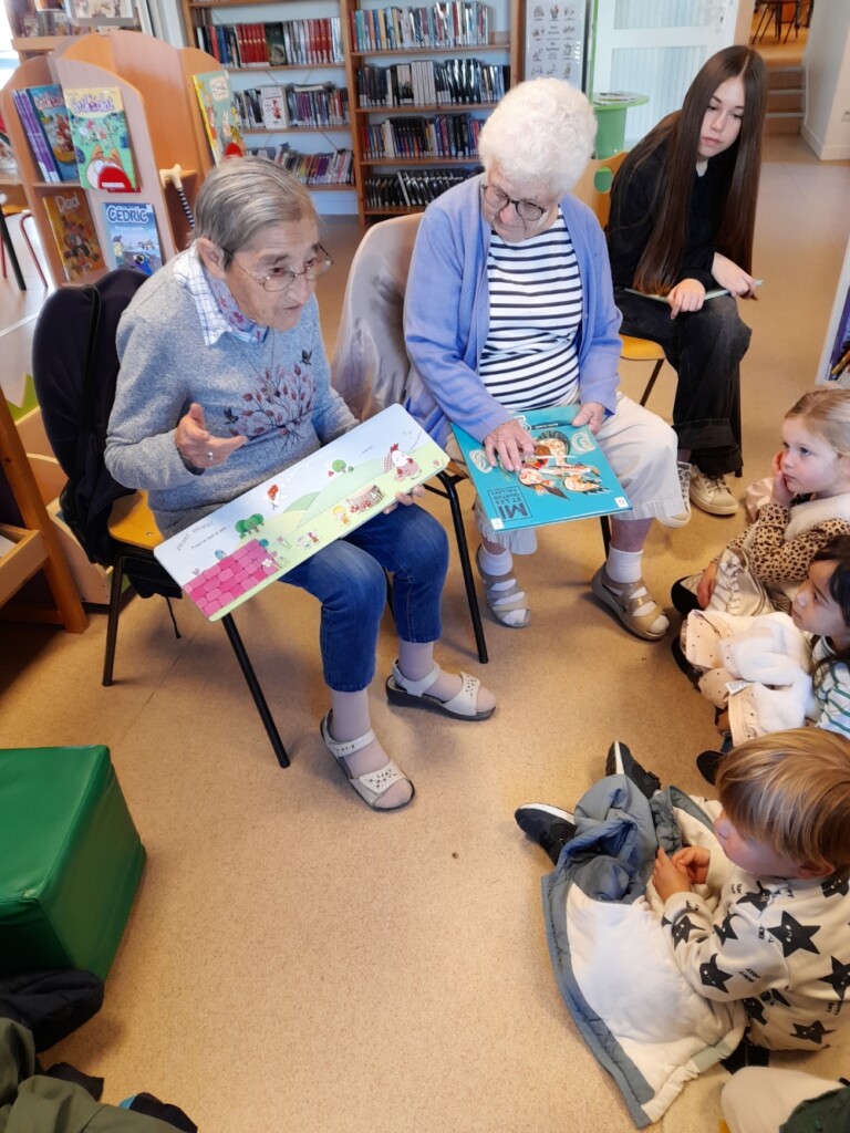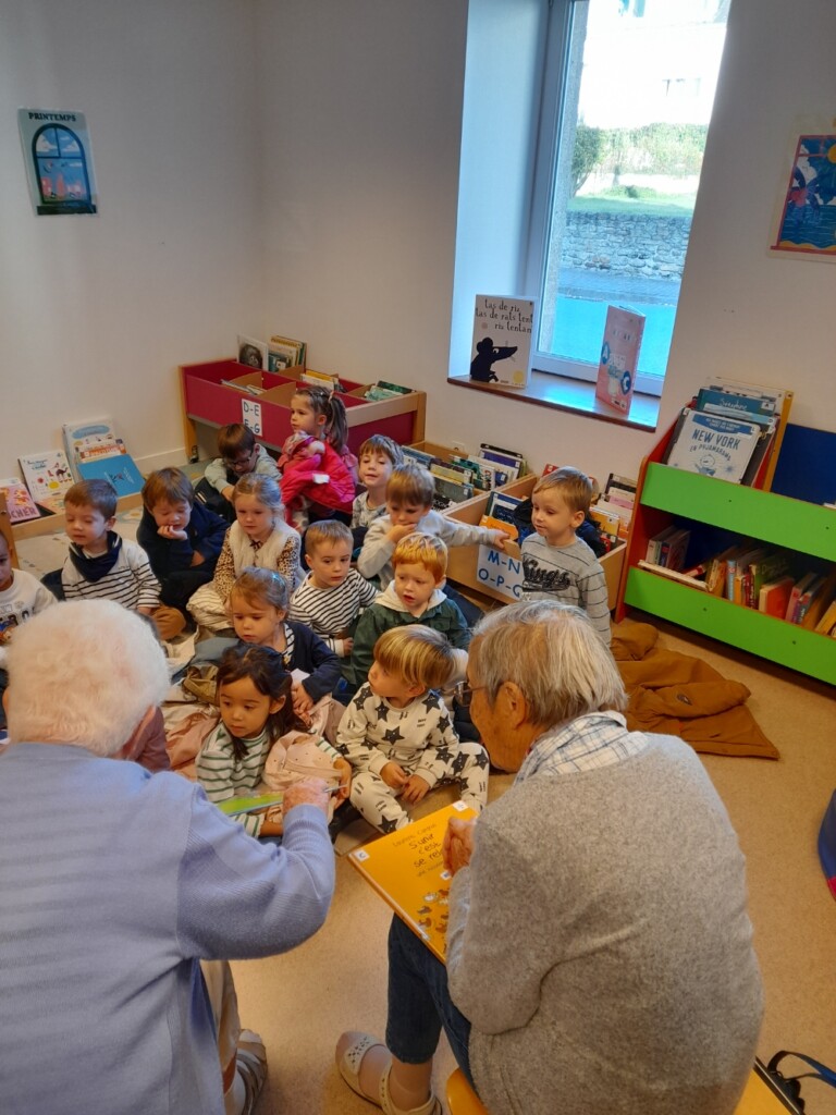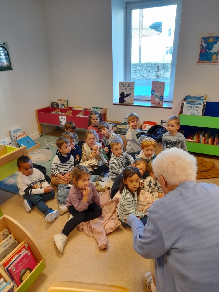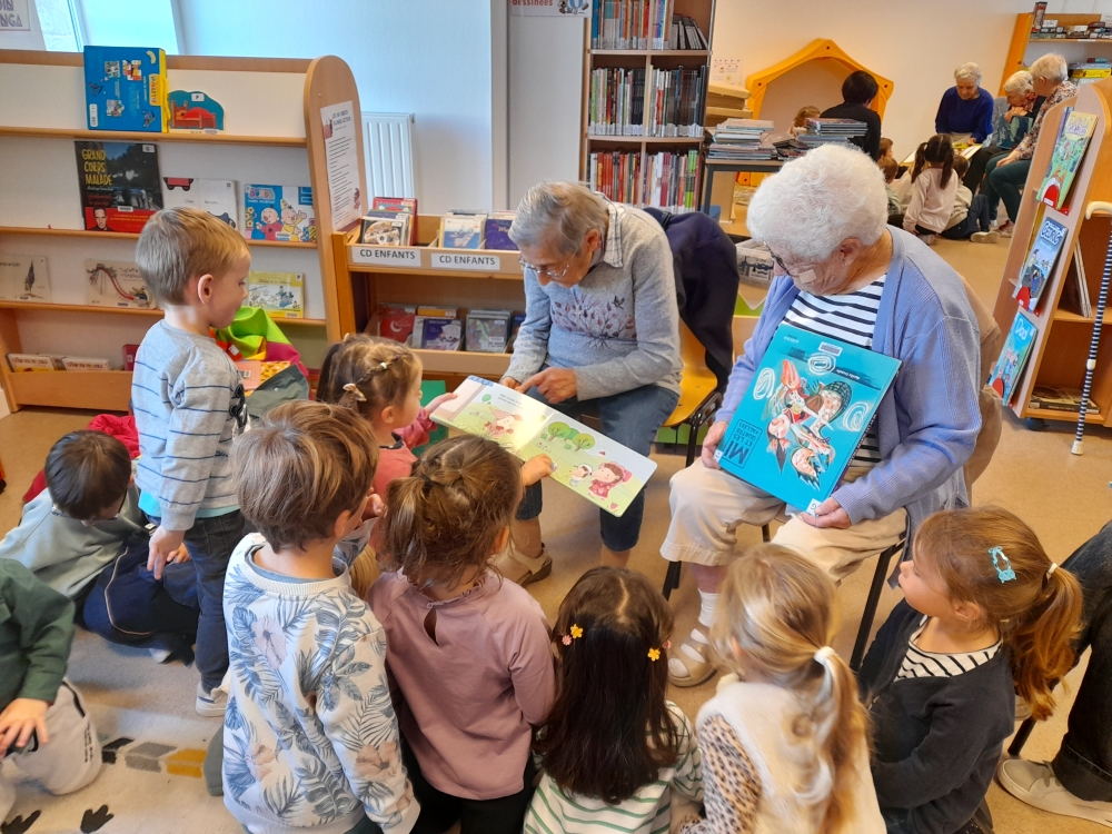 Dans le cadre de la Semaine Bleue, les élèves de maternelles bilingue et monolingue se sont rendus à la médiathèque, à la rencontre des soeurs de Kermaria. Elles ont lu des histoires et ont pu discuter et même chanter avec les enfants. Nous avons tous passé un bon moment !