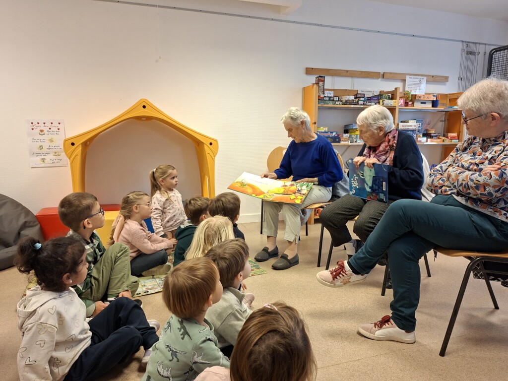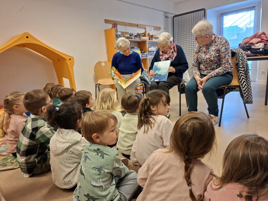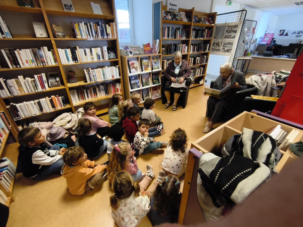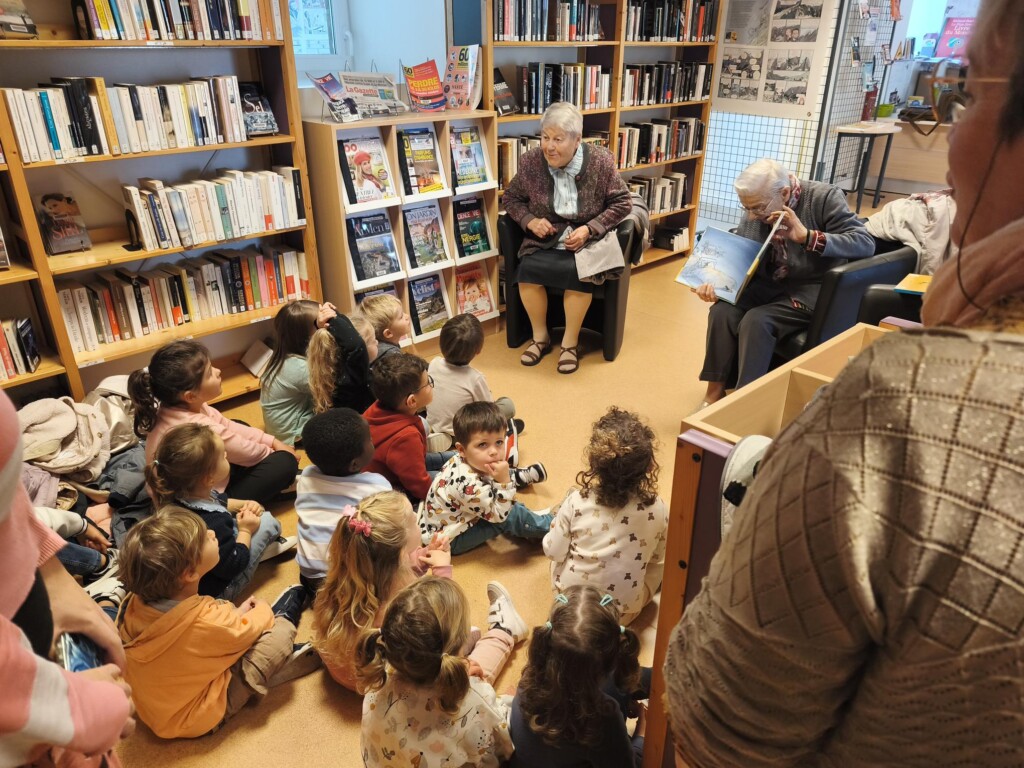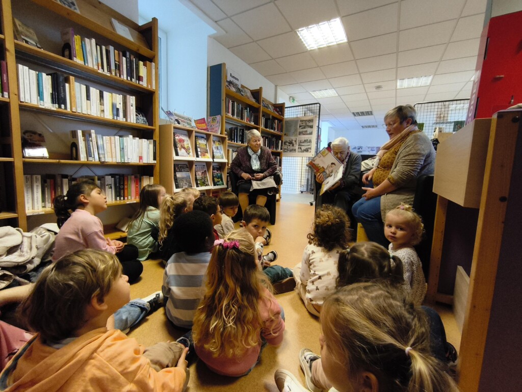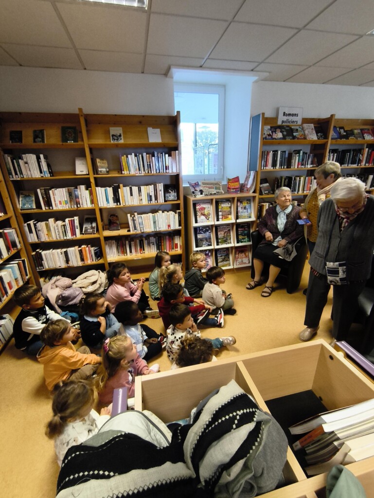 Dans le cadre de la Semaine Bleue, les élèves de maternelles bilingue et monolingue se sont rendus à la médiathèque, à la rencontre des soeurs de Kermaria. Elles ont lu des histoires et ont pu discuter et même chanter avec les enfants. Nous avons tous passé un bon moment !